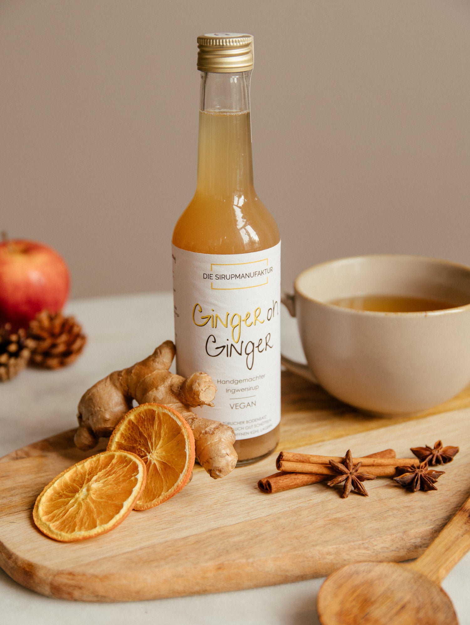 Den grünen Tee mit heißem Wasser aufgießen und kurz ziehen lassen. Den Tee nun gut auskühlen lassen. Den Ginger oh Ginger Sirup und die restlichen Zutaten zusammengießen. Schon ist dein Kickstarter Drink fertig!